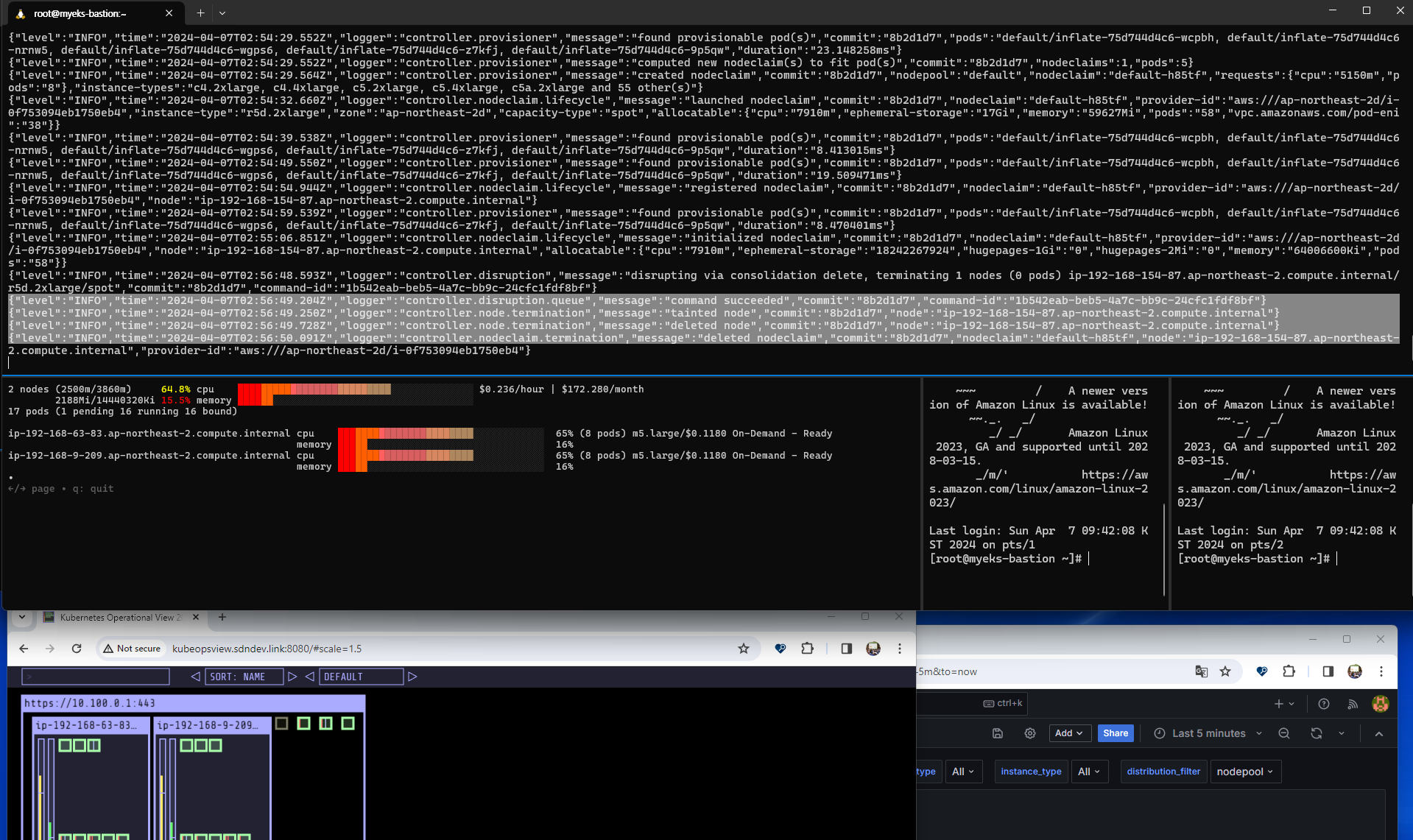 watch -d "kubectl get nodes -L karpenter.sh/nodepool -L node.kubernetes.io/instance-type -L topology.kubernetes.io/zone -L karpenter.sh/capacity-type"