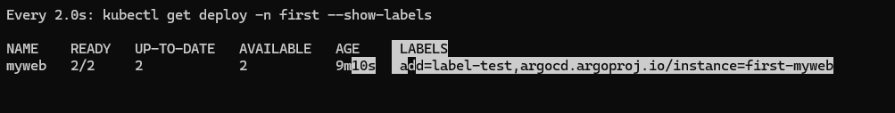 아래와 같이 "watch -d kubectl get deploy -n first --show-labels"를 통해 모니터링해보면 Save를 하면 라벨이 추가된 결과를 확인할 수 있다.