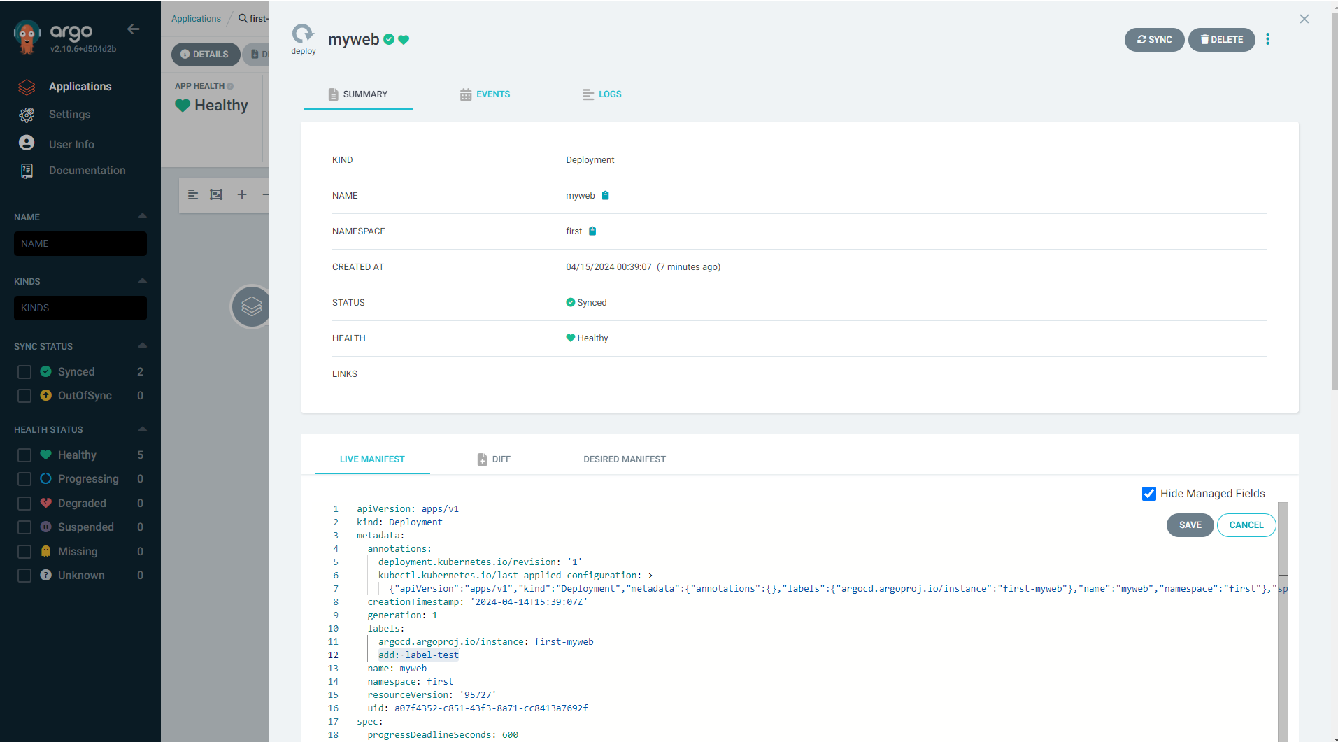 ArgoCD는 Desired Manifest와 비교하여 Sync가 이루어진 후에 Live Manifest 결과로 나타난다. myweb에 대한 Deploy를 선택하고, Live Manifest에서 Edit 버튼을 클릭한 다음 "add: label-test"를 아래 스크린샷과 같이 추가해보자.