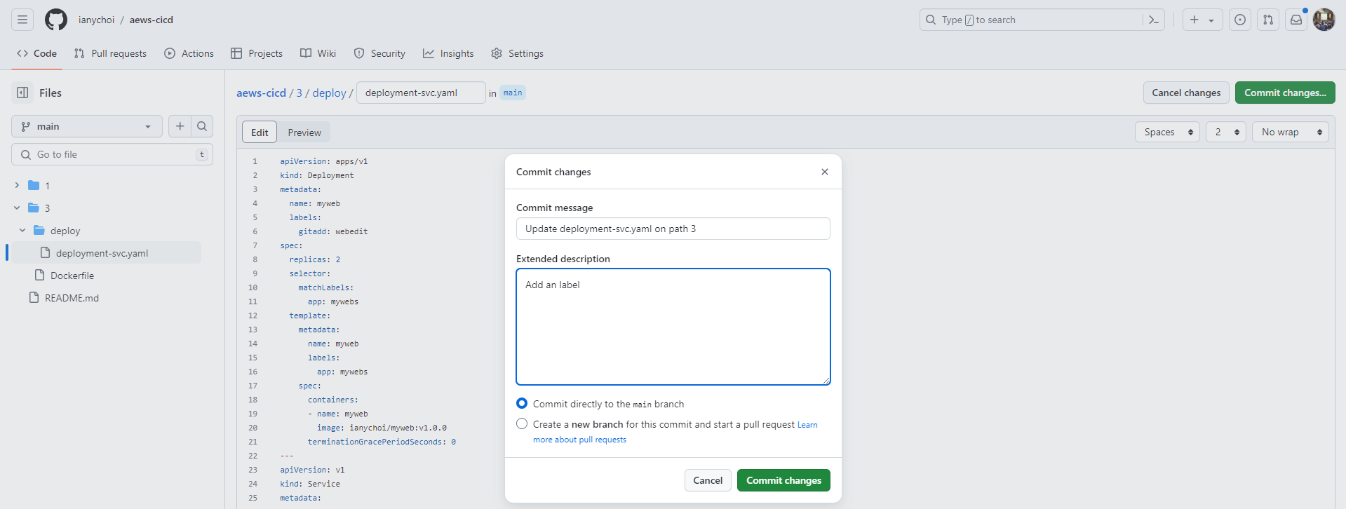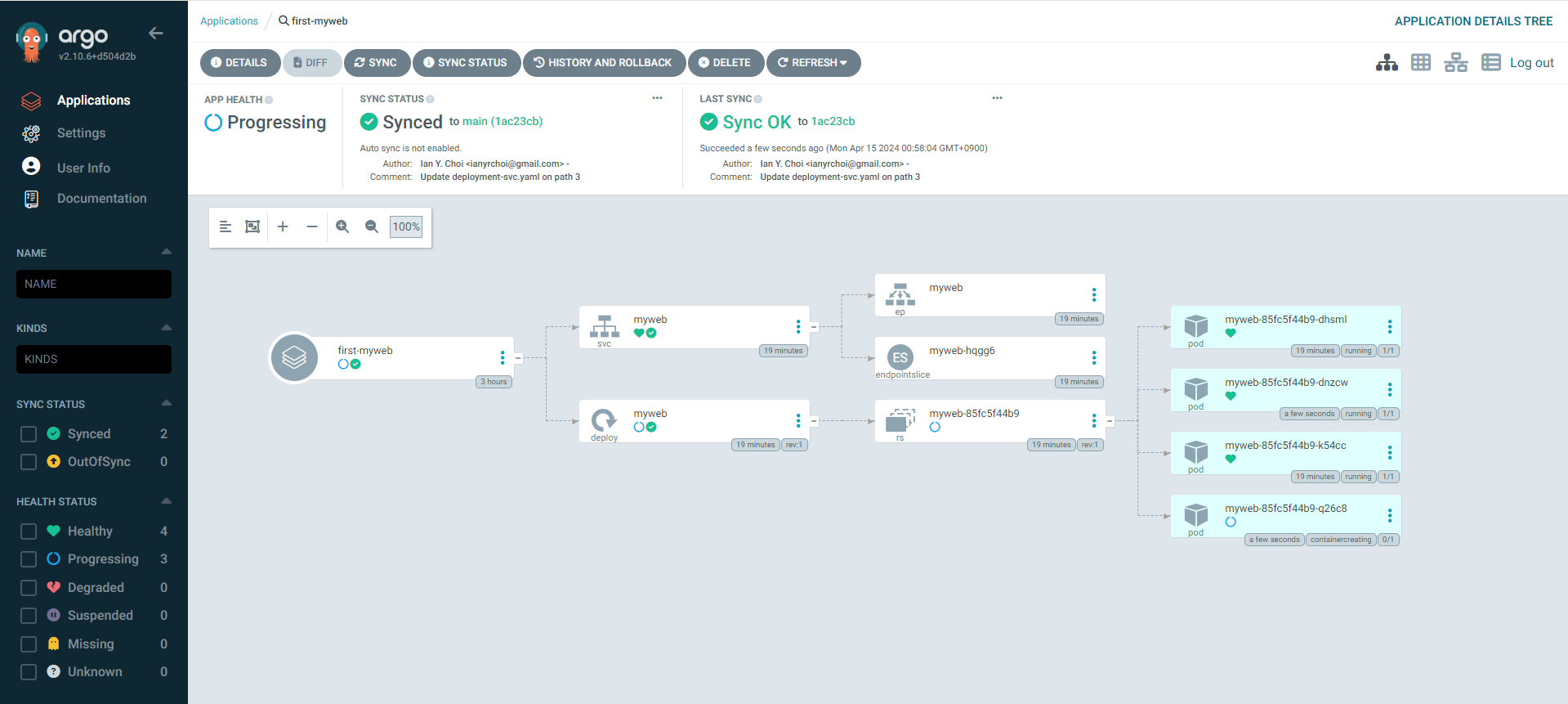 반면 소스 코드에서 "gitadd: webedit"와 같은 라벨을 추가해보면 약 3분이 지나서 ArgoCD에서 확인하거나 또는 "Refresh" 버튼을 클릭하여 확인할 수 있다.