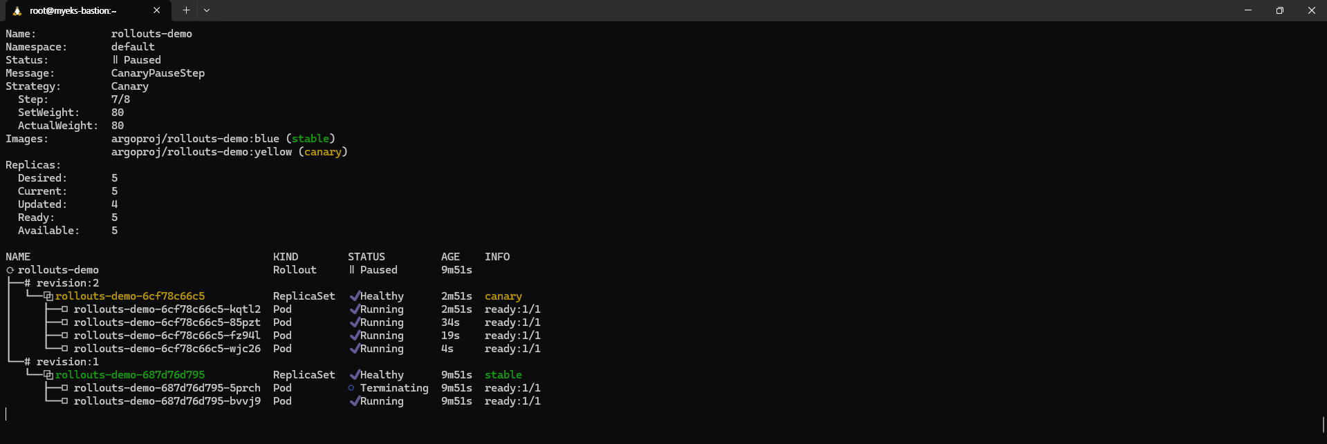 20%가 진행되었고 멈추어 있는 단계이다. 웹 페이지에서 "Promote" 버튼을 클릭하거나 CLI에서 "kubectl argo rollouts promote rollouts-demo"라고 입력해도 된다. 그러면 다음 과정이 진행되었다가 10초 후 멈추고 그 다음 과정을 계속 진행하는 식으로 동작할 것이다.