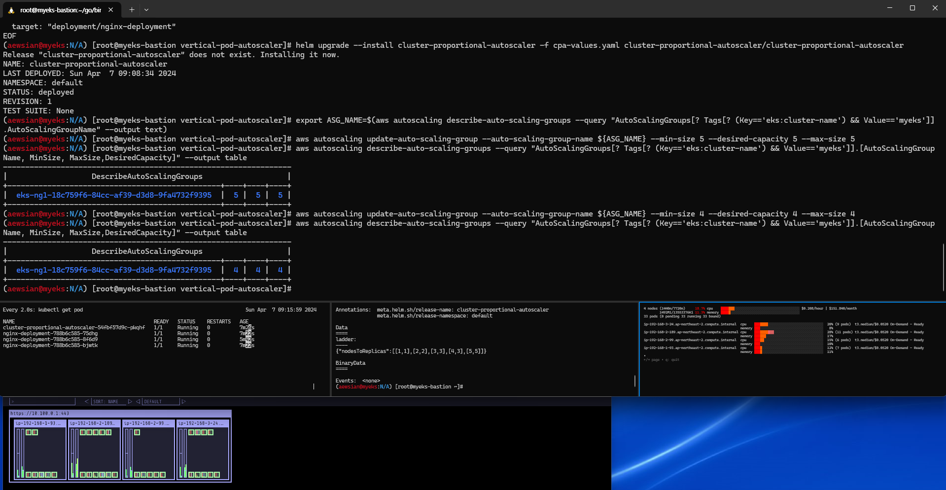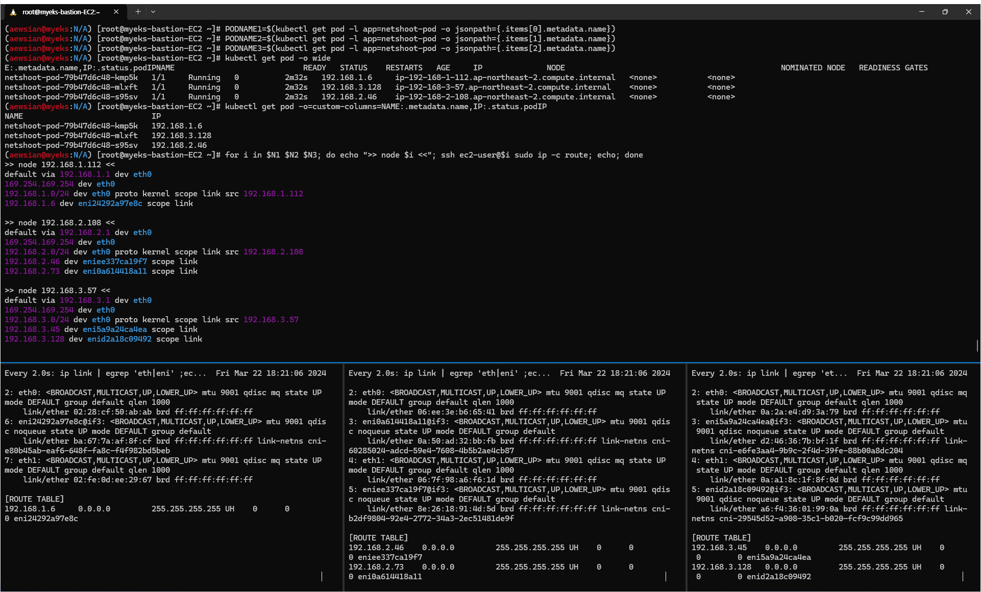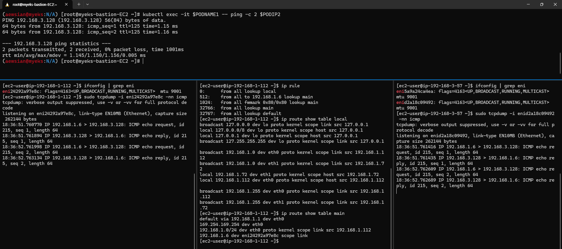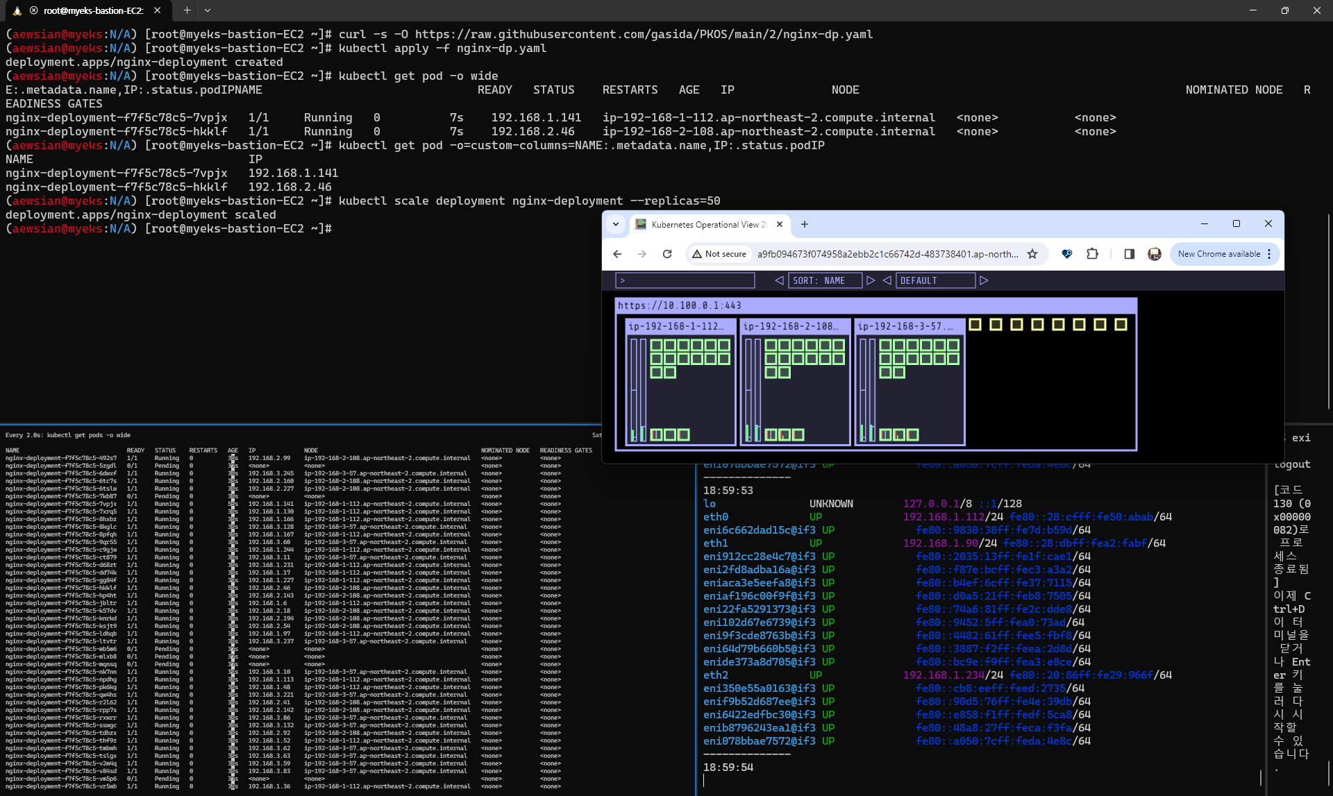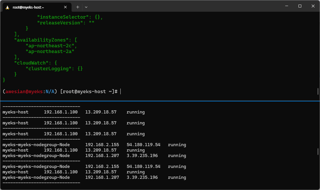 기다려보면 터미널 A에서 2개의 public IP 로 보이던 부분이 갑자기 내부 네트워크 서브넷으로 변경된 부분을 확인할 수 있었다.