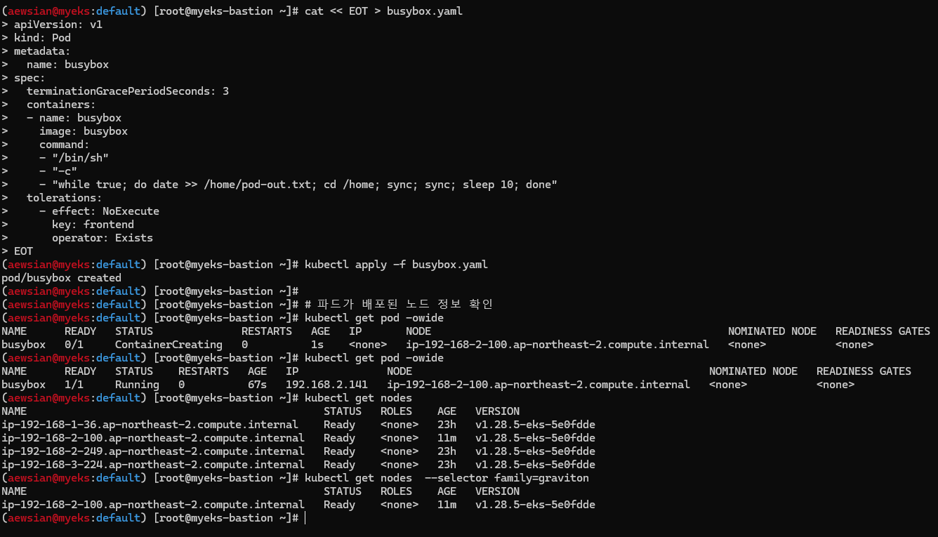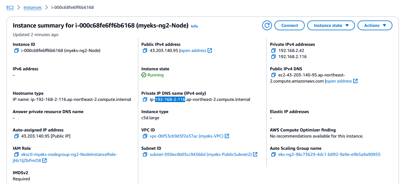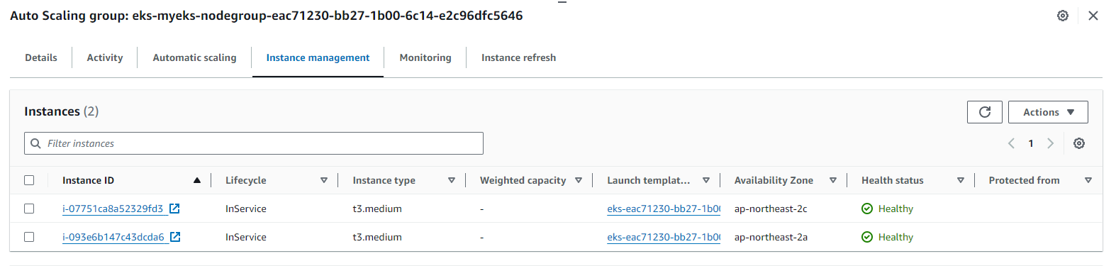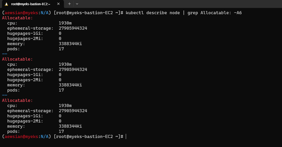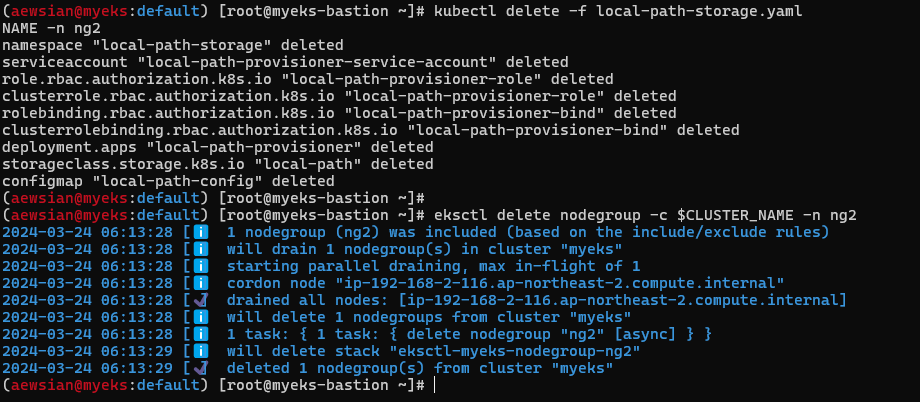 myeks myeks-nodegroup ACTIVE 2024-03-09T18:02:34Z 2 2 2 t3.medium AL2_x86_64 eks-myeks-nodegroup-eac71230-bb27-1b00-6c14-e2c96dfc5646 managed