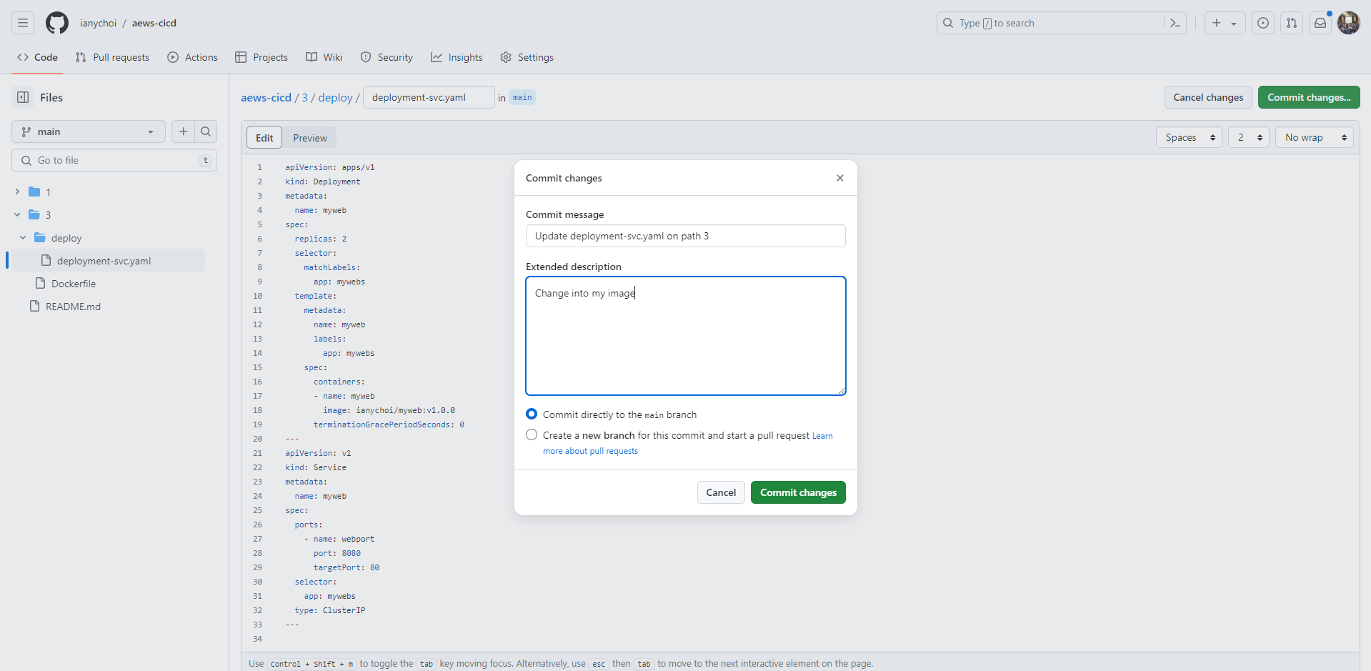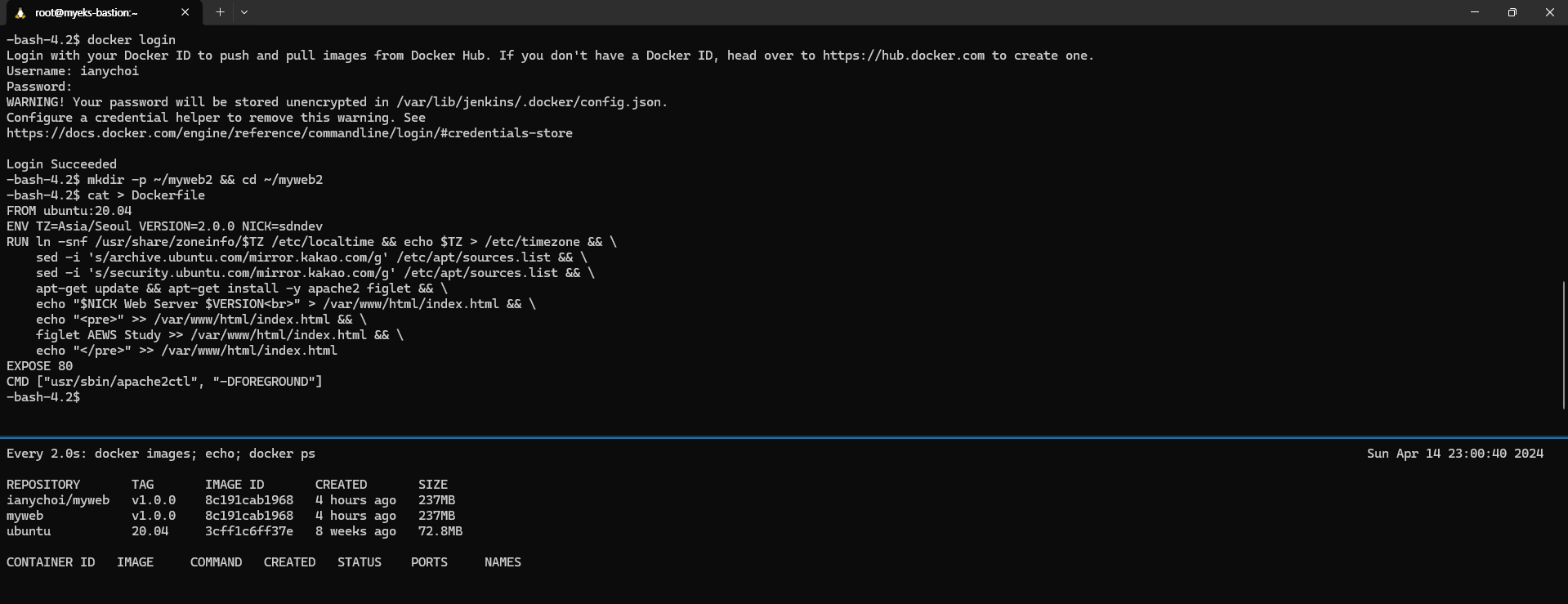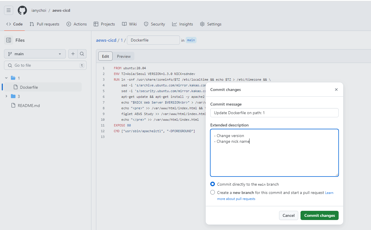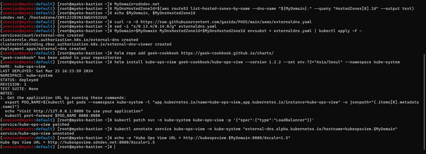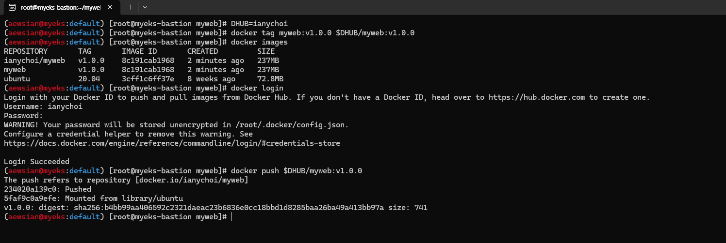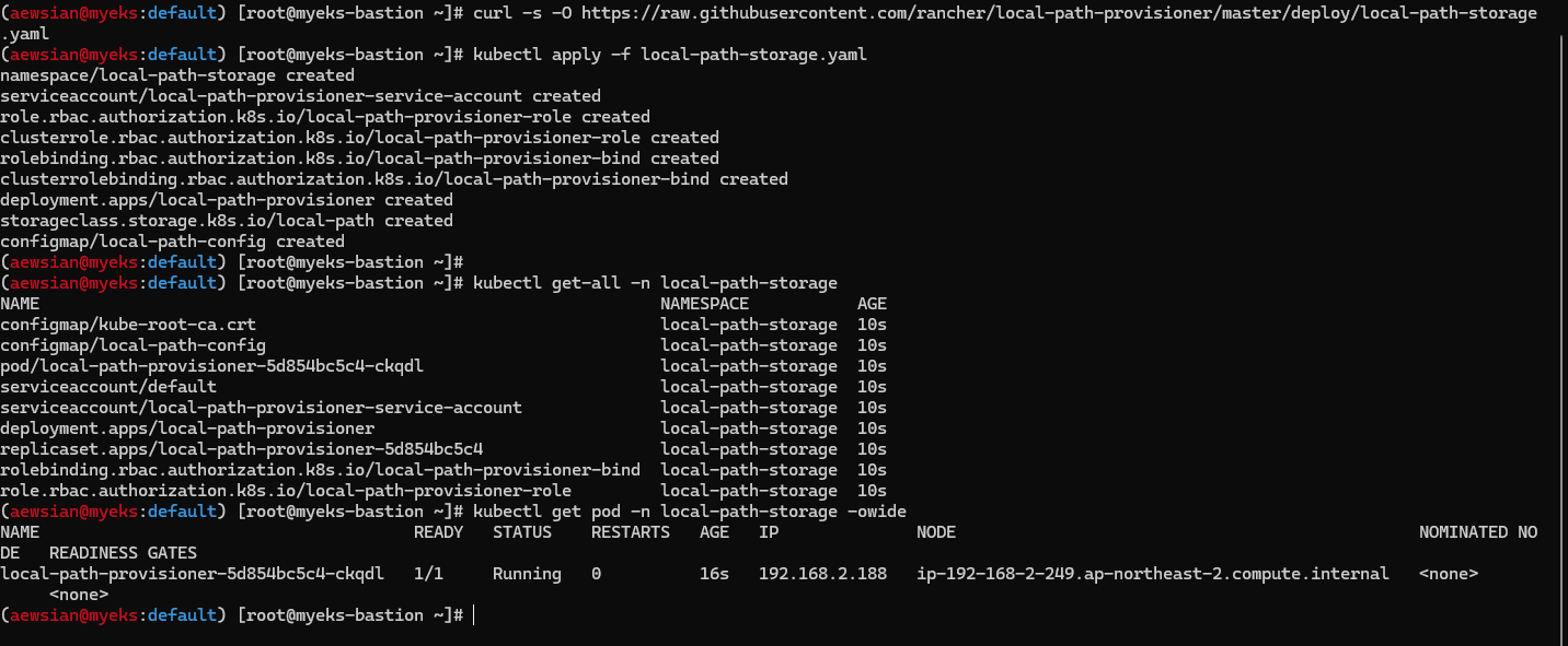 $ aws cloudformation deploy --template-file myeks-1week.yaml --stack-name myeks --parameter-overrides KeyName=kp-ian SgIngressSshCidr=$(curl -s ipinfo.io/ip)/32 --region ap-northeast-2