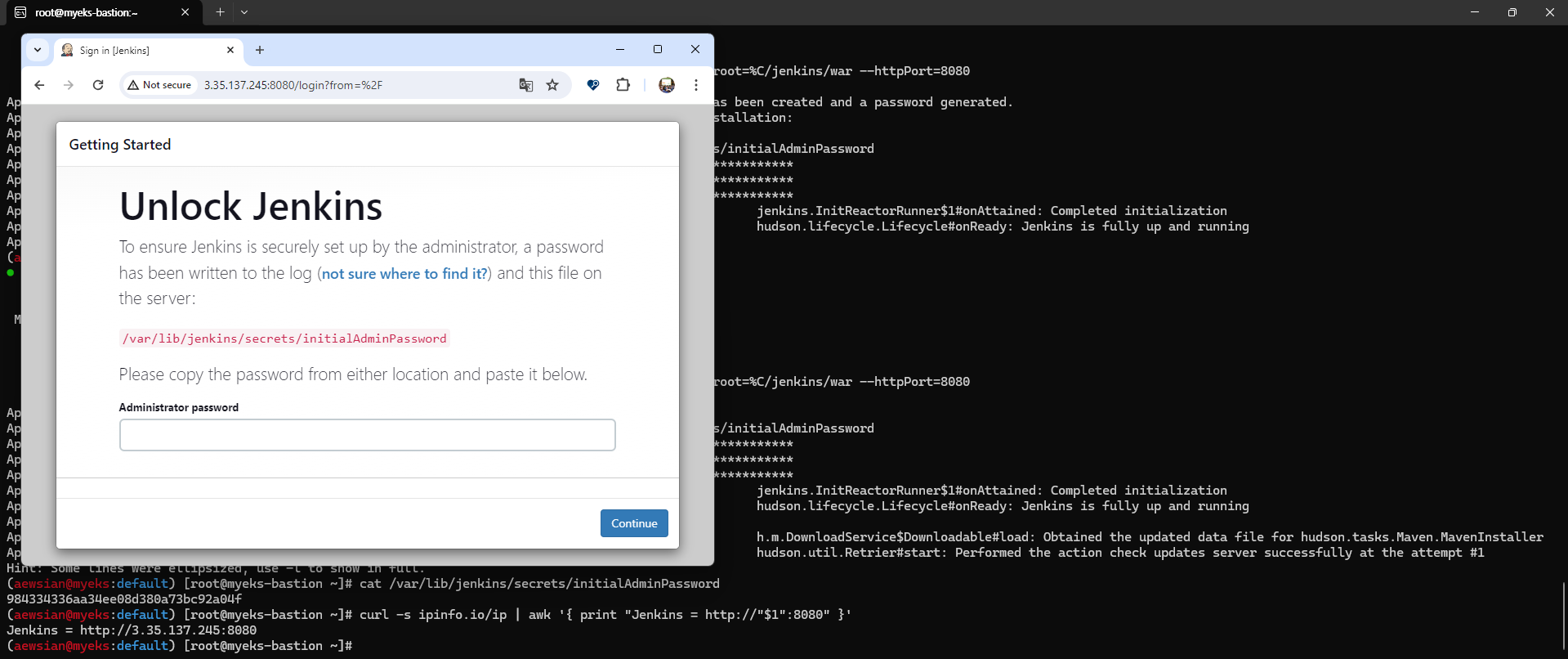 aws eks update-cluster-config --region $AWS_DEFAULT_REGION --name $CLUSTER_NAME --resources-vpc-config endpointPublicAccess=true,publicAccessCidrs="$(curl -s ipinfo.io/ip)/32",endpointPrivateAccess=true