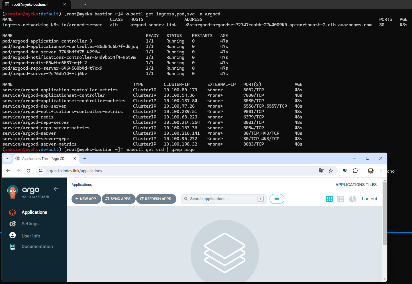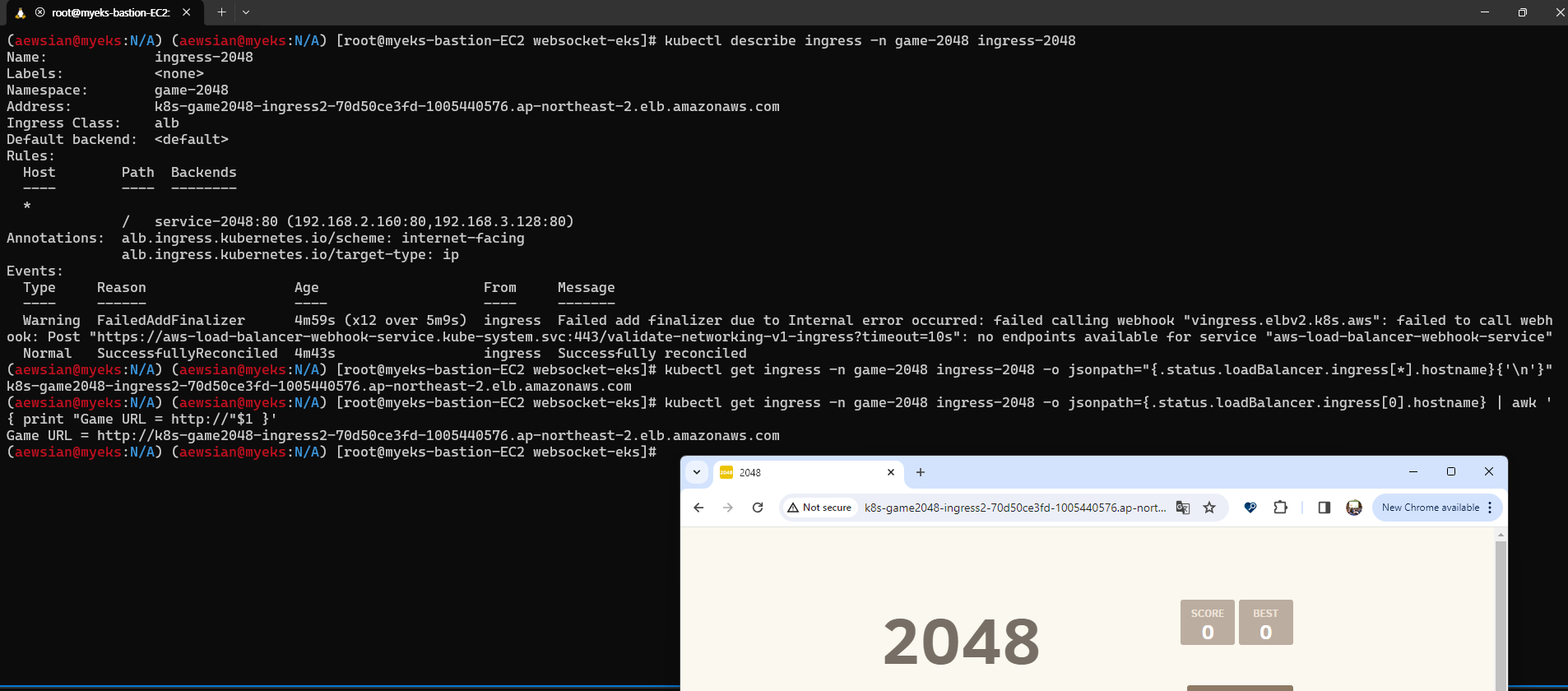 kubectl get ingress -n game-2048 ingress-2048 -o jsonpath={.status.loadBalancer.ingress[0].hostname} | awk '{ print "Game URL = http://"$1 }'