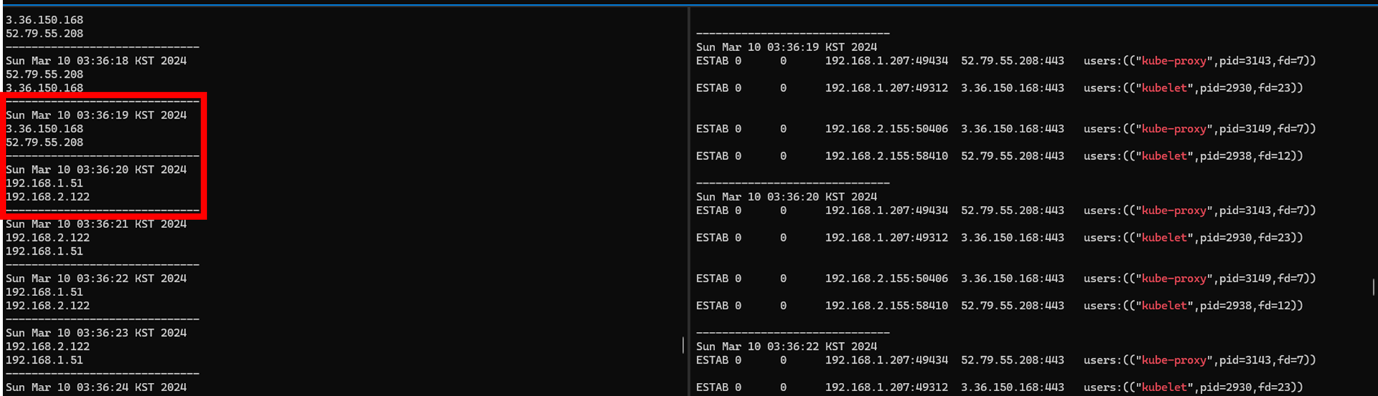 while true; do ssh ec2-user@$N1 sudo ss -tnp | egrep 'kubelet|kube-proxy' ; echo ; ssh ec2-user@$N2 sudo ss -tnp | egrep 'kubelet|kube-proxy' ; echo "------------------------------" ; date; sleep 1; done