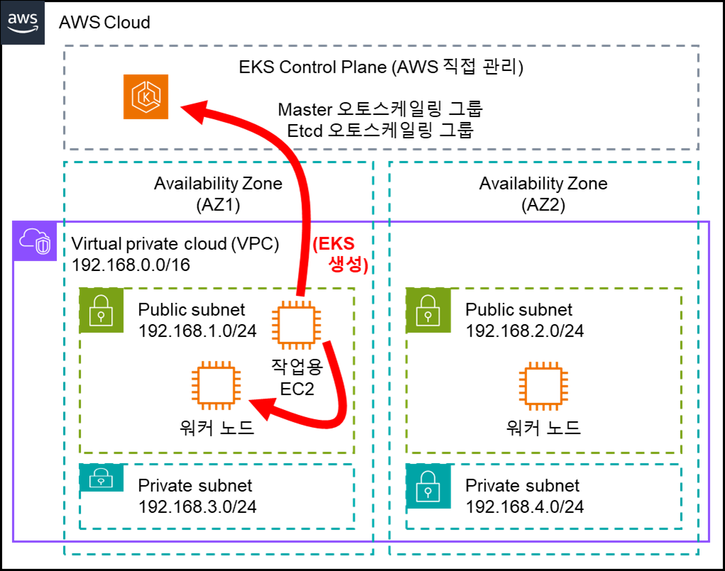위 이미지에서 나온 컨트롤 플레인에 보면 cloud-controller-manager, etcd, kube-api-server, scheduler, Controller Manager 이렇게 5개 요소가 있는데, 해당 요소를 직접 설치하여 관리하는 대신 Amazon EKS라는 관리형 서비스를 생성하여 쿠버네티스 노드들을 활용하게 된다. 자세한 내용은 EKS 워크샵 설명(링크)에도 있으니 이를 참고하자.