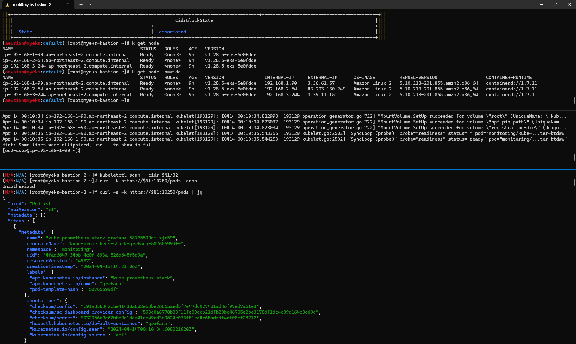 위 첫 번째 명령어를 실행한 다음에는 kube-proxy에 대한 연결이 private IP로 이루어지는 것을 볼 수 있으며,