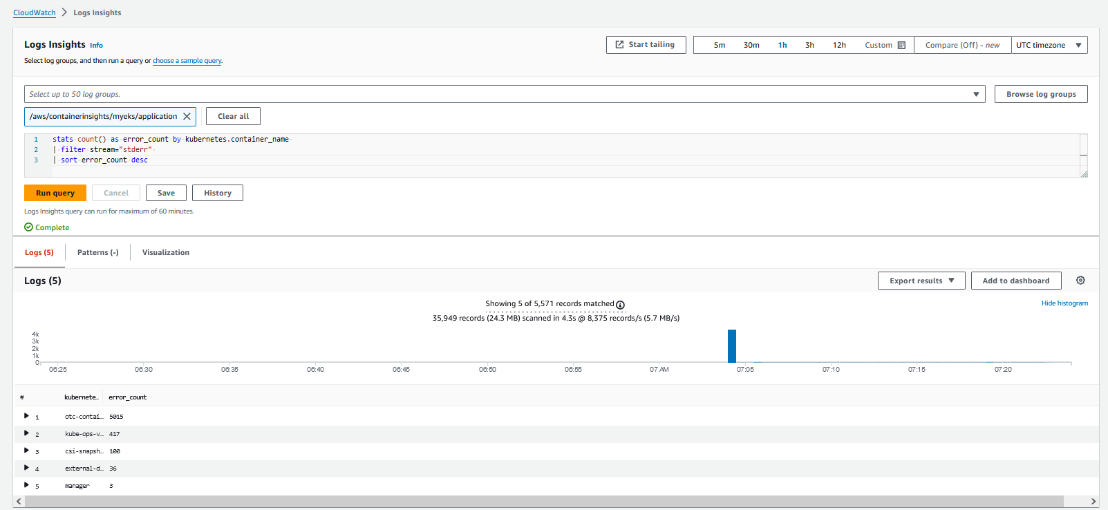 이번에는 CloudWatch에서 "Log Insights"를 선택해보다. 로그 그룹에서 myeks 관련된 내용이 나타나는 것을 볼 수 있다. "/aws/eks/myeks/cluster"를 선택한 다음 아래 쿼리들을 실행해보자.