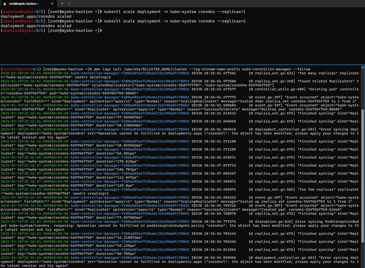 aws logs tail /aws/eks/$CLUSTER_NAME/cluster --log-stream-name-prefix kube-controller-manager --follow