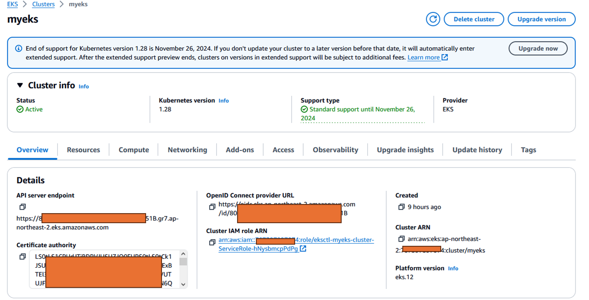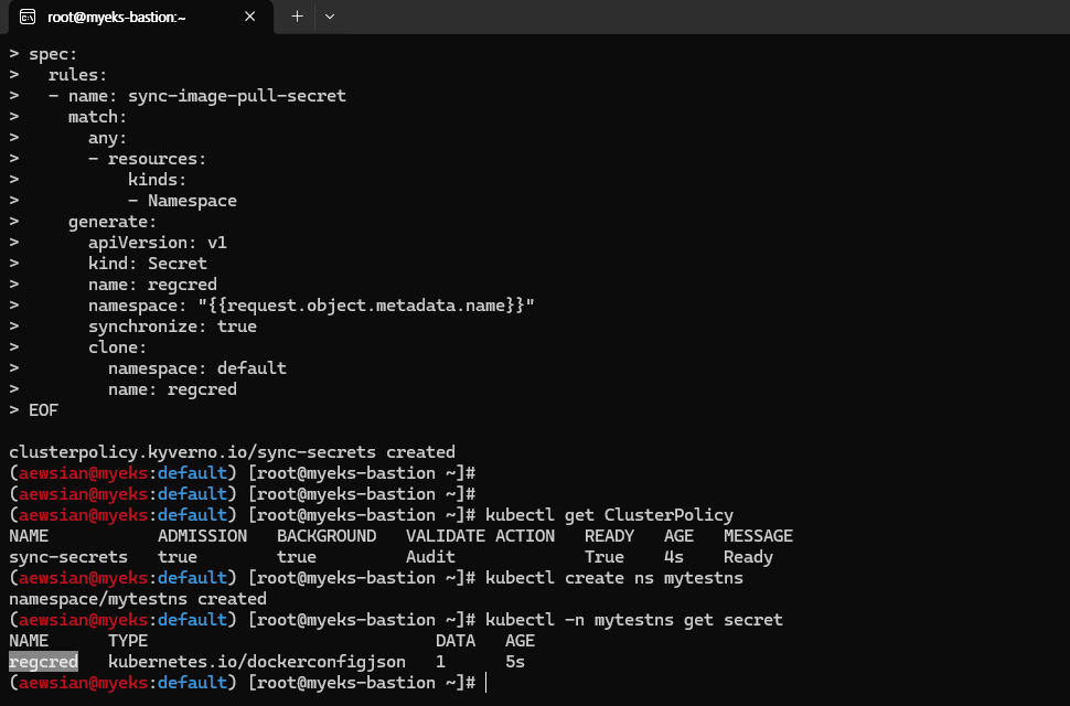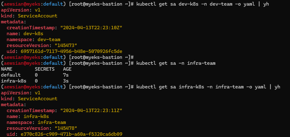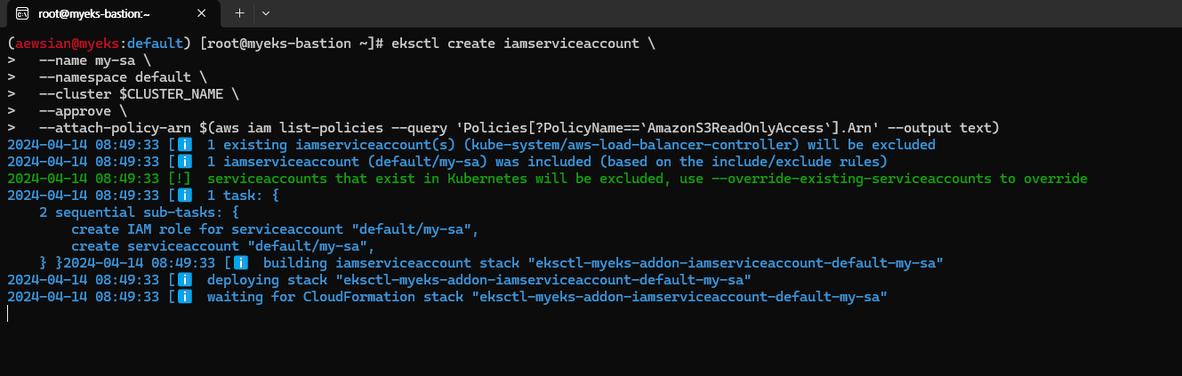 aws cloudformation deploy --template-file eks-oneclick5.yaml --stack-name myeks --parameter-overrides KeyName=kp-ian SgIngressSshCidr=$(curl -s ipinfo.io/ip)/32 MyIamUserAccessKeyID=`cat ~/.aws/credentials | grep aws_access_key_id | awk '{print $3}'` MyIamUserSecretAccessKey=`cat ~/.aws/credentials | grep aws_secret_access_key | awk '{print $3}'` ClusterBaseName=myeks --region ap-northeast-2