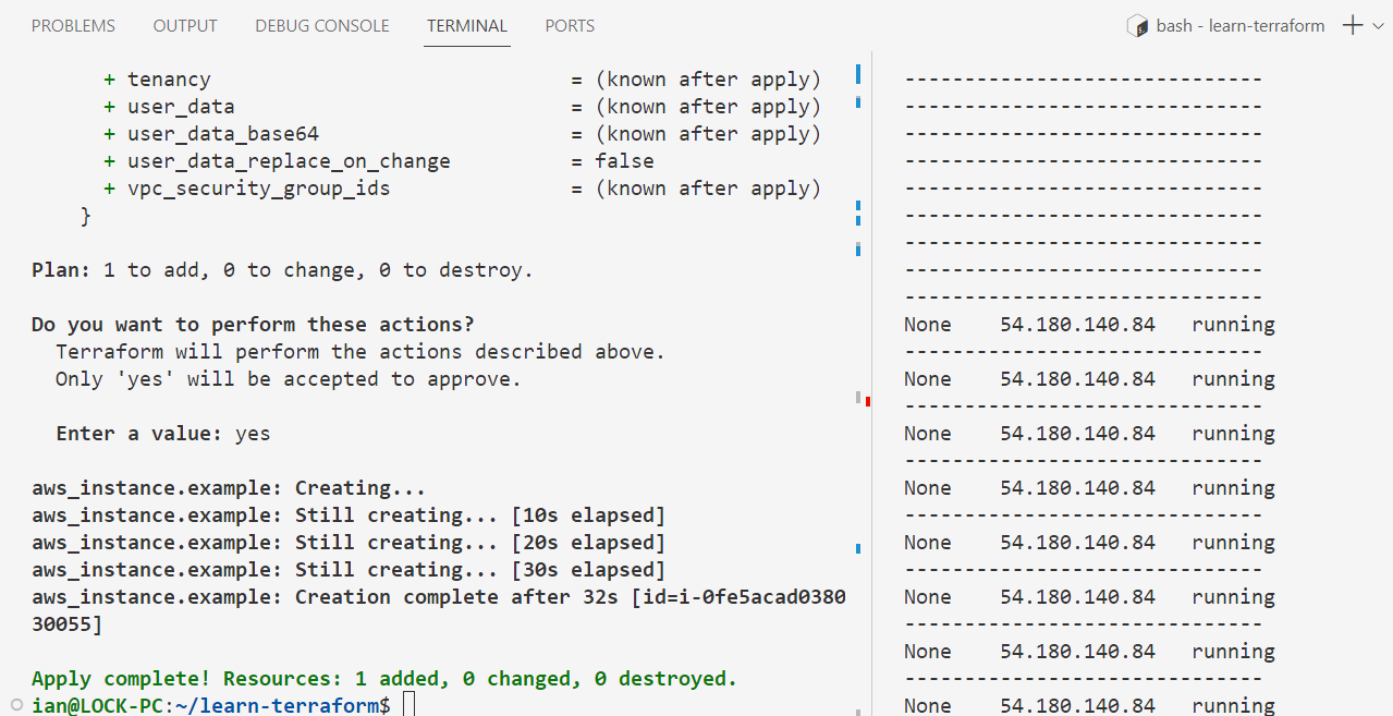 또한 EC2가 생성이 되는지 모니터링을 하는 명령어를 별도 터미널로 실행해두도록 하자.