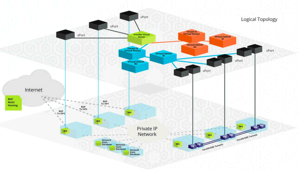 Midokura 회사에서 개발하는 MidoNet은 OpenStack 등의 클라우드 관리 플랫폼 계층과 KVM 등의 Hypervisor 계층 사이에서 일종의 네트워크 가상화 계층을 두어 다음과 같은 네트워크 기능을 제공하도록 설계되었다.